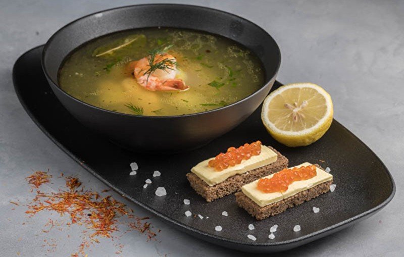 Креветка , семга , треска , картофель , морковь лук зеленый , долька лимона